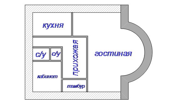 Теперь посмотрим, что получили в 3D-значок на верхней панели. Покрутили с помощью орбиты) Ну вот первые шаги уже получаются. Теперь посмотри немного другой вариант - пооригинальнее. Переходим опять в ОКНО ПЛАНА ЭТАЖА - значок на верхней панели, указателем выбираем нашу полукруглую стенку и удаляем с помощью Delete. Теперь левой кнопкой мыши нажимаем на значок СТЕНА один раз, на верхней панели геометрических вариантов выбираем прямолинейная отдельная. Снова появился крестик, наводим опять его на край стены (должна появиться жирная галочка), нажимаем левой кнопкой мыши и ведем нашу стену по направлению к другой стене на оределенное расстояние (например на 2 метра). Когда мы начинаем вести появляется небольшая панелька прямо "под руку", в ней-то мы и указываем расстояние просто нажав цифры на клавиатуре, они автоматом будут печататься в этой панельке))) - очень удобно. Начертили? А теперь и сдругой стороны проделайте то же самое. Но получилось вот что: